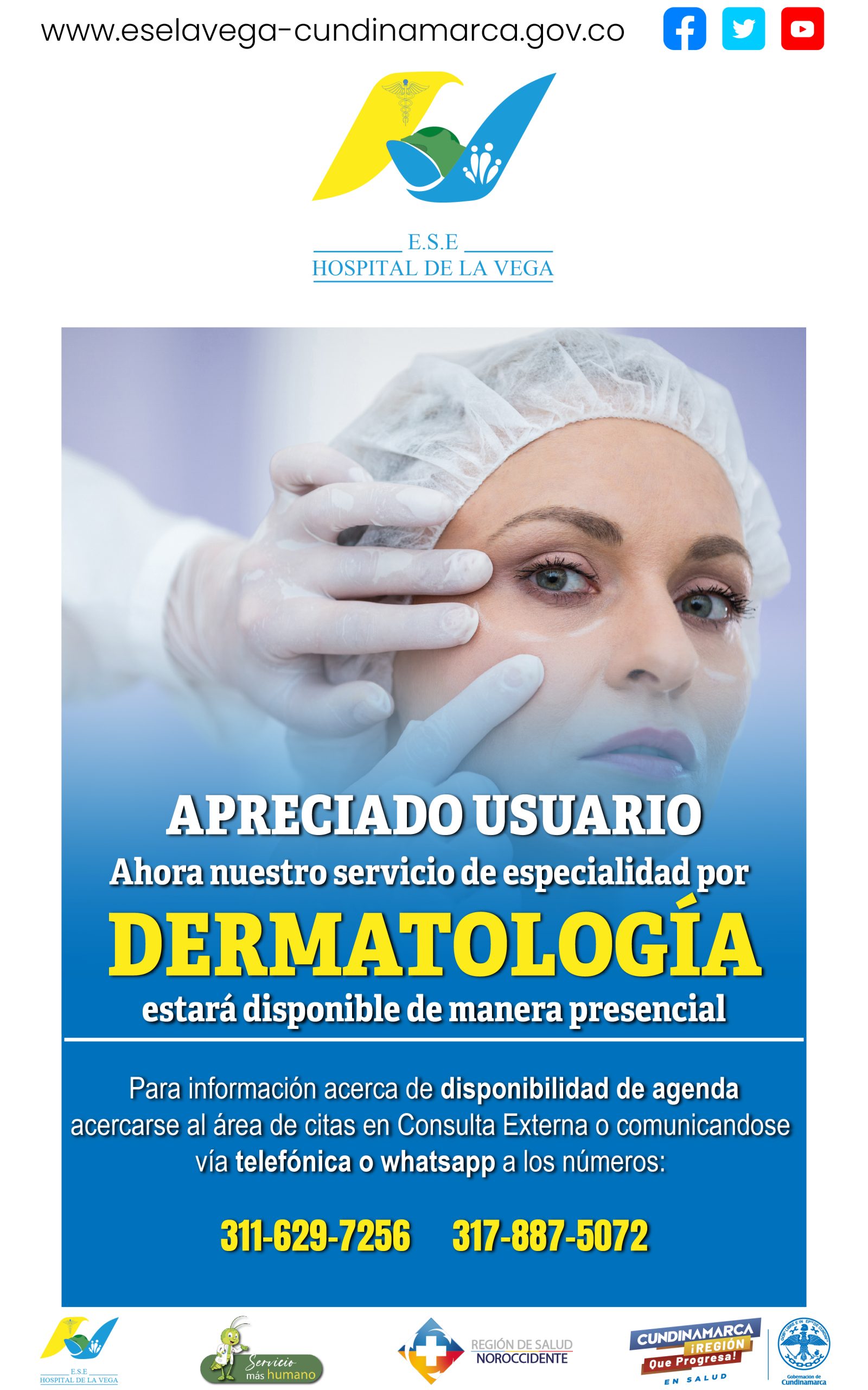 La Vega, Nocaima, Salud Ahora nuestro servicio de DERMATOLOGÍA es presencial 16 febrero, 2023 Posted by Comunicaciones 16 Feb