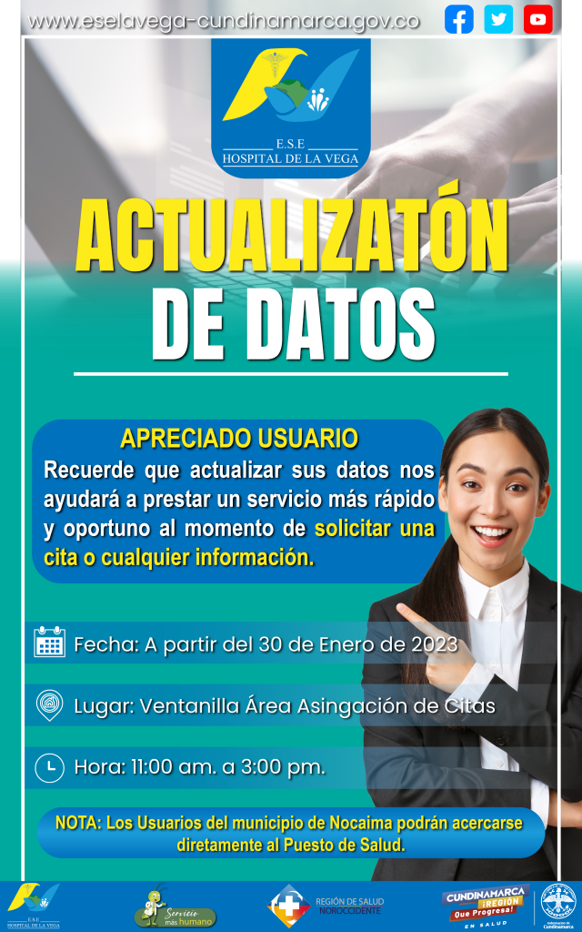 Apreciado Usuario y Comunidad en General, la E.S.E HOSPITAL DE LA VEGA te invita a participar este próximo 24 de Enero en la Jornada de Atención al Usuario y Jornada de Capacitación en Participación Ciudadana por parte de la Superintendencia Nacional de Salud