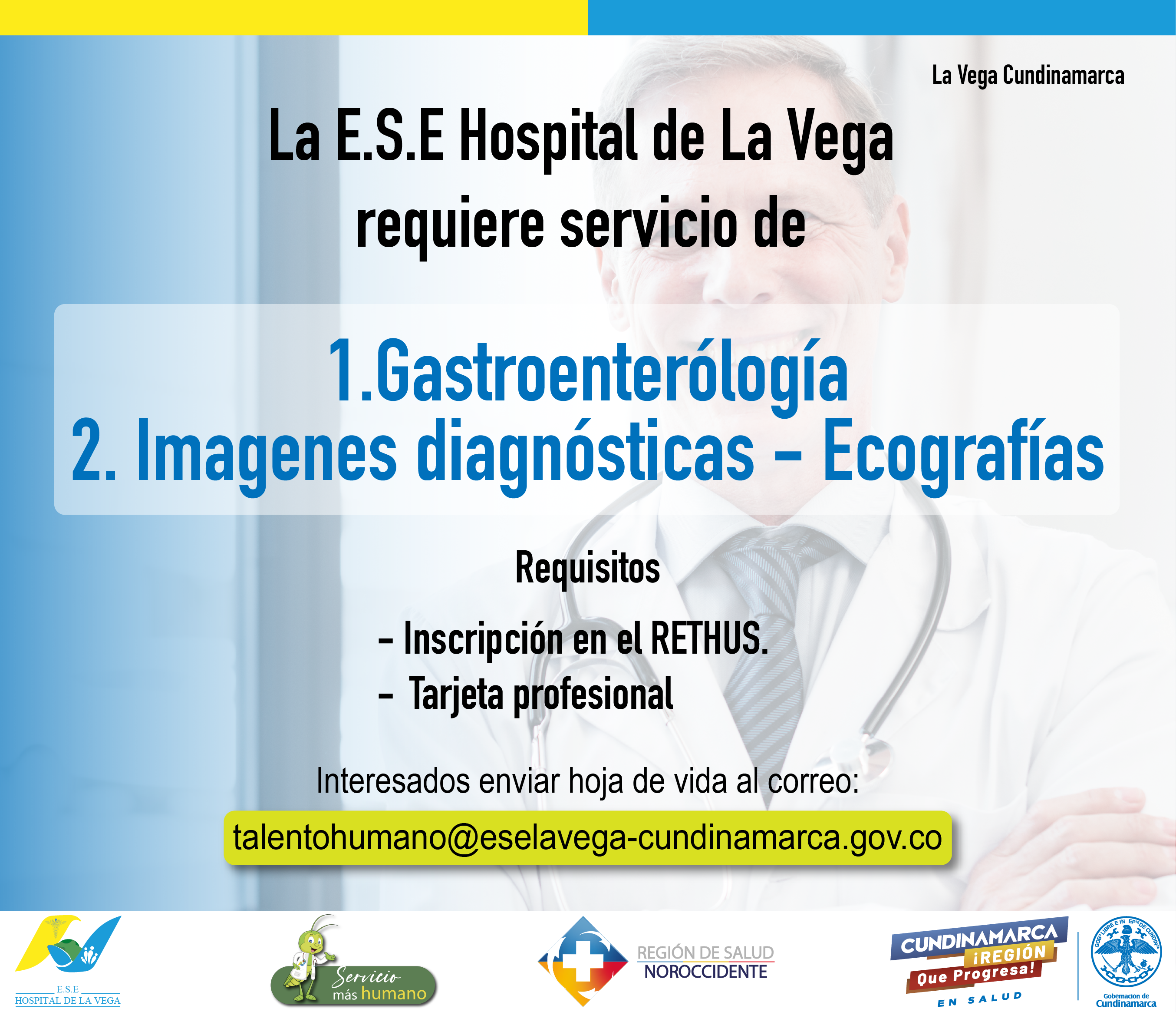 La Vega, Nocaima, Salud La E.S.E HOSPITAL DE LA VEGA REQUIERE SERVICIO DE GASTROENTEROLOGÍA E IMÁGENES DIAGNÓSTICAS – ECOGRAFÍAS 4 marzo, 2023 Posted by Comunicaciones 06 Dic