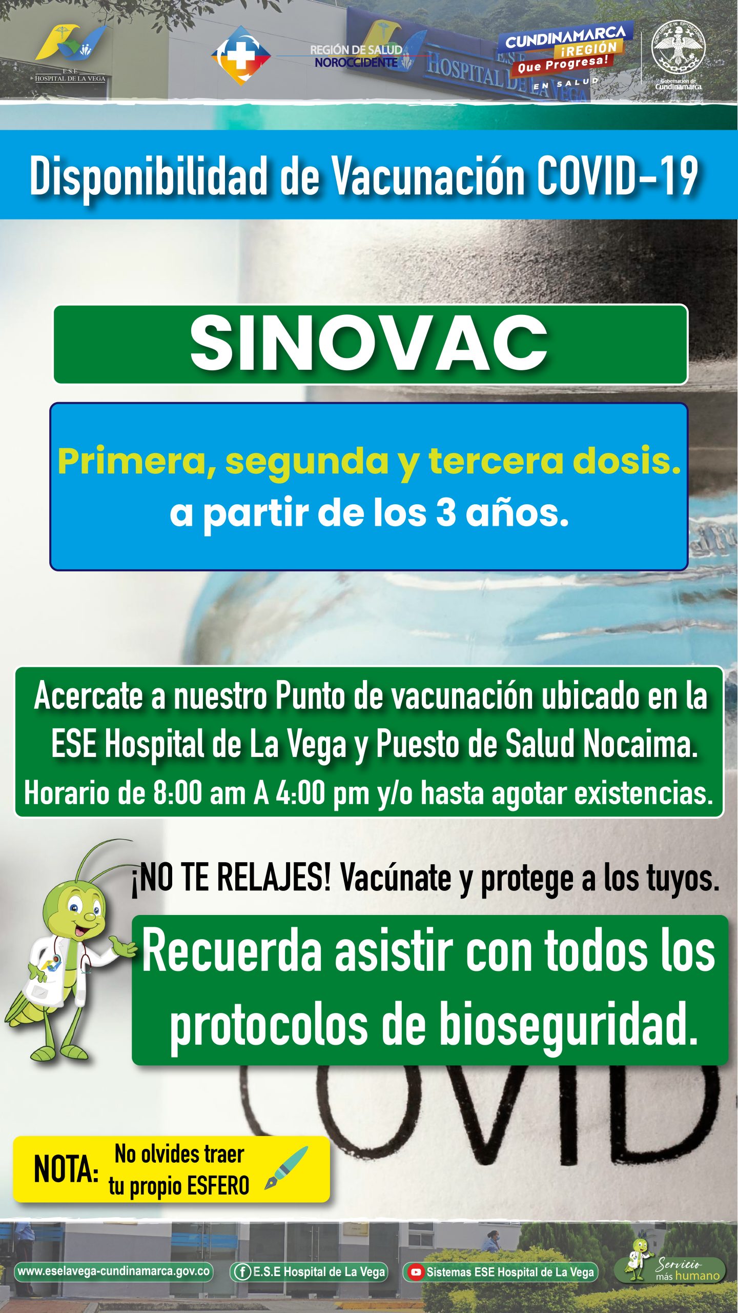 La Vega, Nocaima, Salud Vacunación Covid-19 Disponible para hoy 22 de agosto 22 agosto, 2022 Posted by Comunicaciones 22 Ago